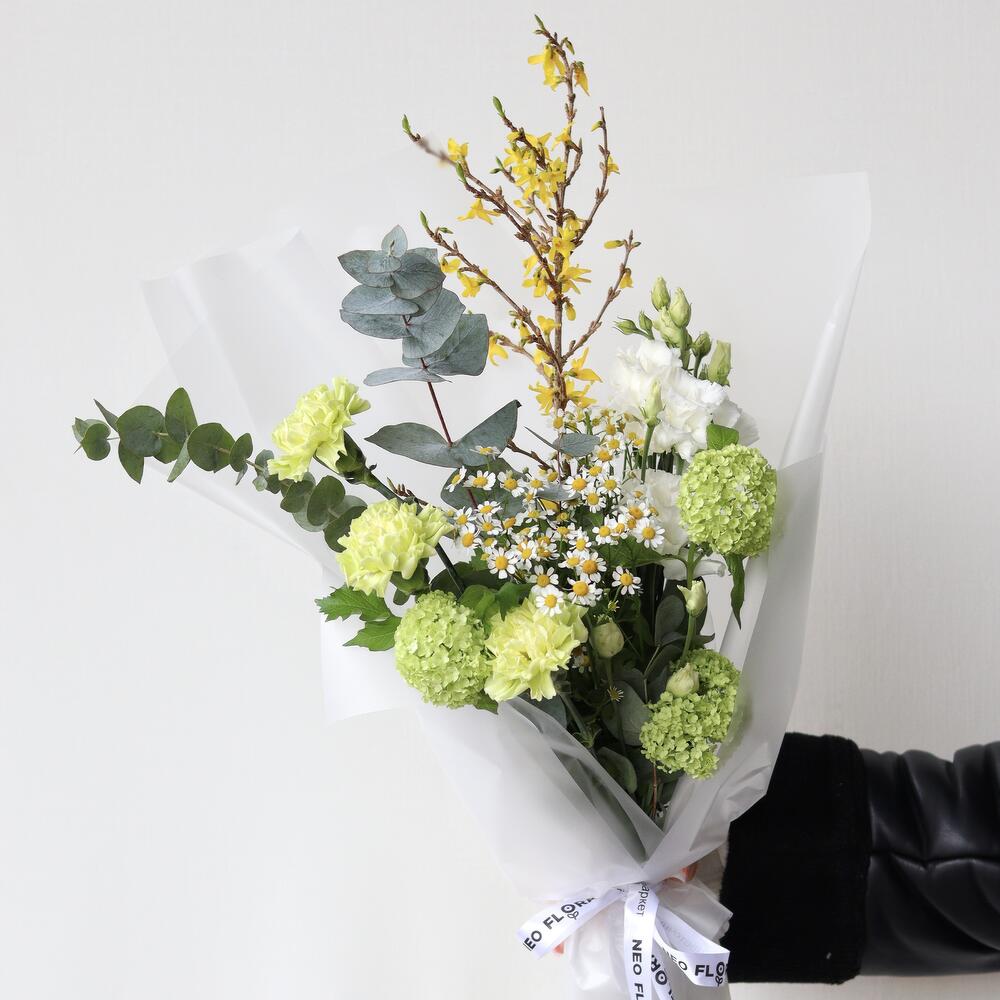 Состав: вибурнум, танацетум, эустома, эвкалипт, диантус, форзиция